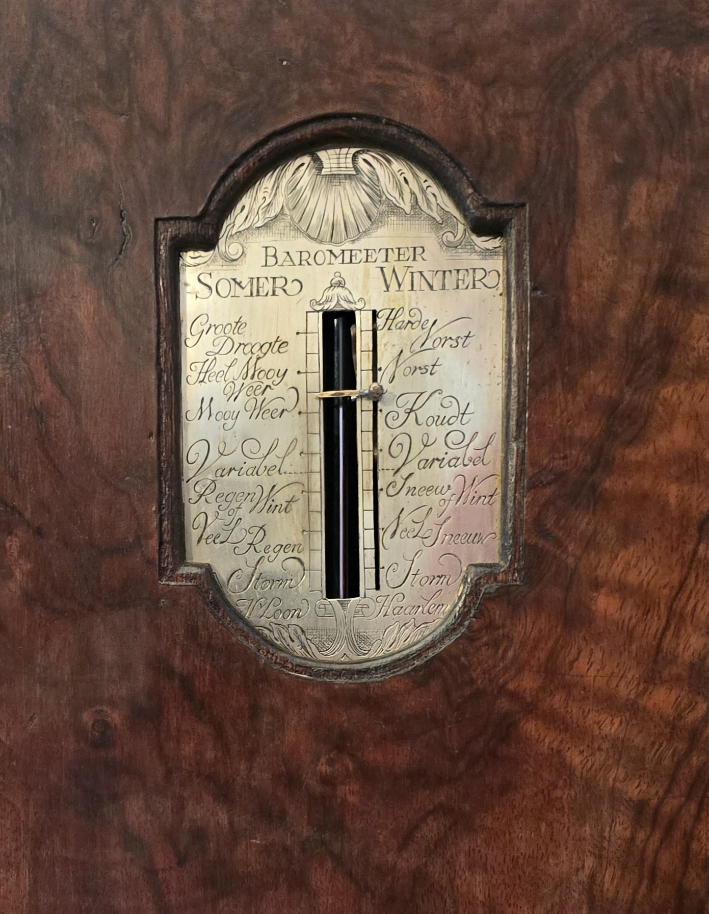 Een bijzonder vroeg voorbeeld van een staande klok met een barometer in de deur.